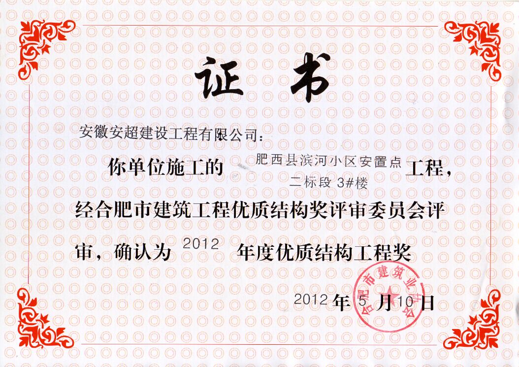 2012年度肥西濱河小區(qū)市優(yōu)質(zhì)結(jié)構(gòu)工程獎(jiǎng)