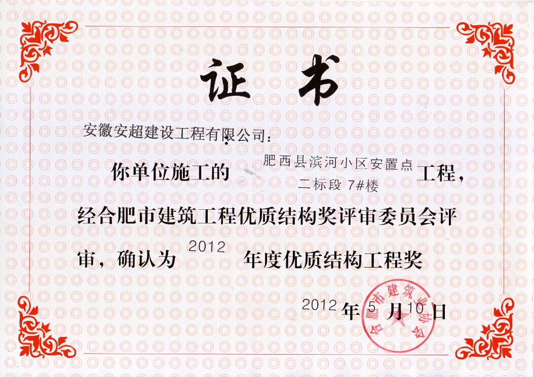 2012年度肥西濱河小區(qū)市優(yōu)質(zhì)結(jié)構(gòu)工程獎(jiǎng)