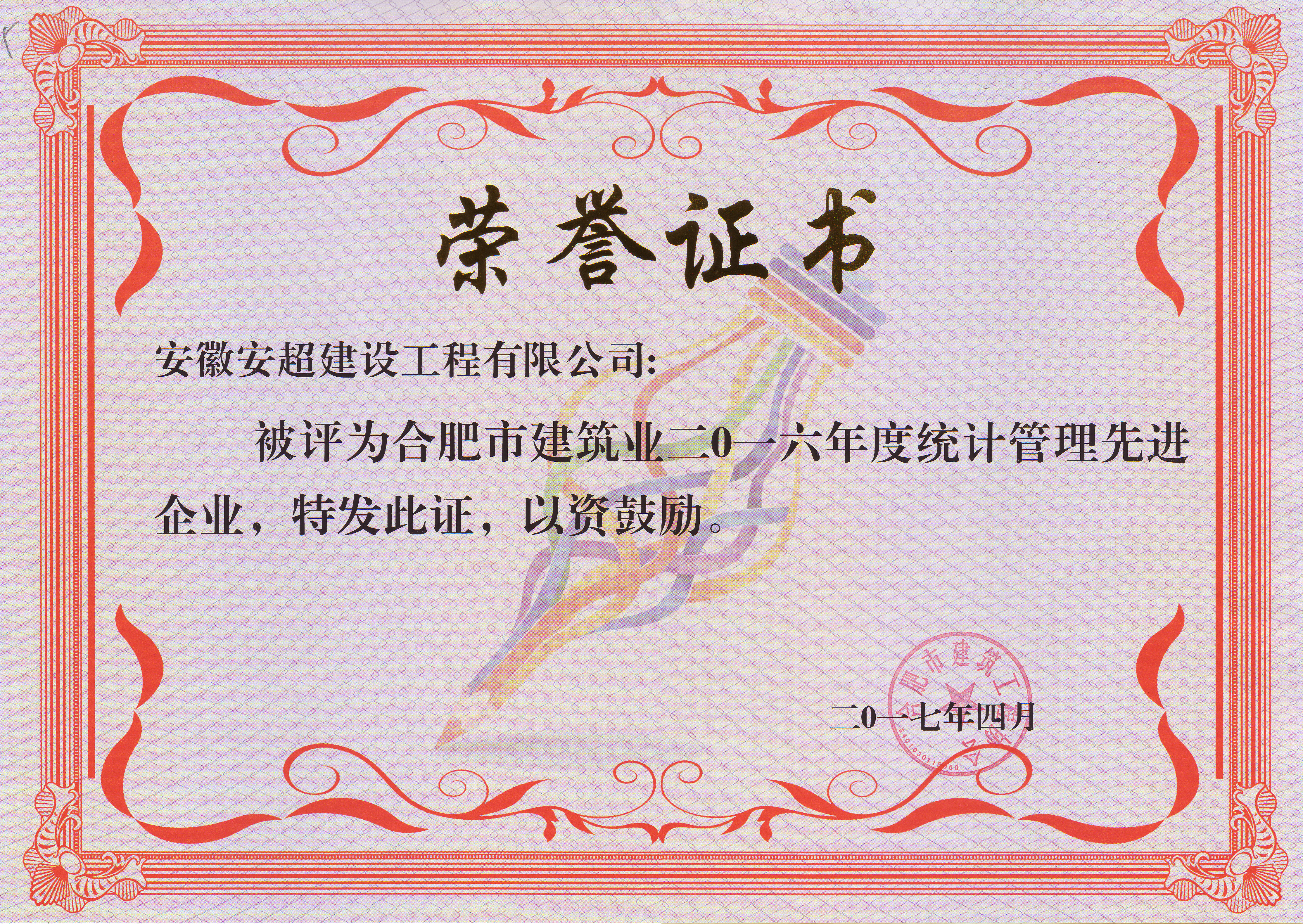 合肥市建筑業(yè)2016年度統(tǒng)計管理先進(jìn)企業(yè)